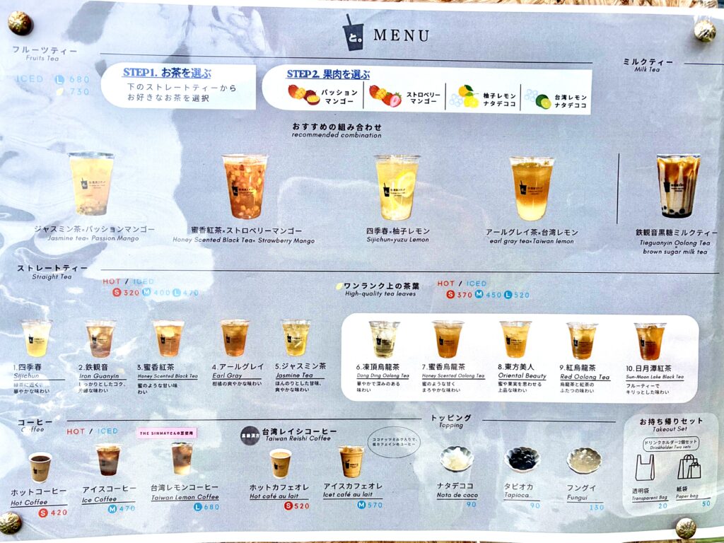 - お茶:四季春・蜂蜜紅茶・アールグレイ・鉄観音・ジャスミン茶など全10種。ワンランク上の、なかなか見かけない台湾茶も。