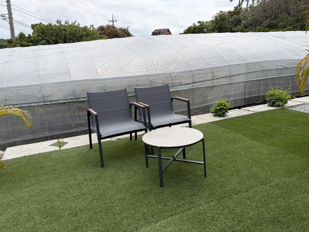 店舗の小屋に、人工芝の庭。こぢんまりしていて、テイクアウトしてイスやパラソル付きの席で友達とお話や、赤ちゃんと一緒に、それぞれゆっくりできるような雰囲気です。