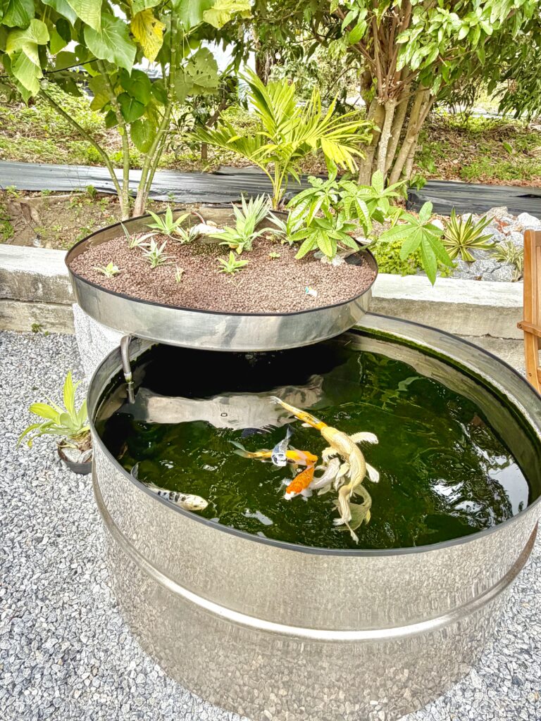 大通りの喧騒から離れた静かな場所で、鯉が泳いでいたり、植物に囲まれながらのんびりとできる空間となっています。